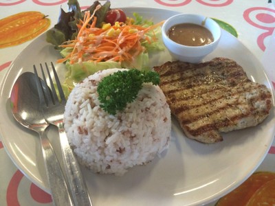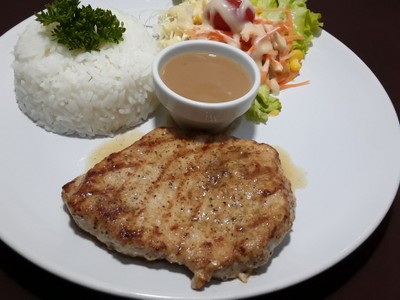 ร้านสเต็ก ติดป้ายบอกตรงๆ ว่าทำตามเมนูของทางร้านเท่านั้น ราคาไม่แพง ( เช็คอิน พร้อมรูปภาพอาหาร และโพสต์ว่า หิว...จนต้องร้องขอชีวิต )แล้วนำไปให้พนักงานดู จะได้นักเก็ตไก่ที่ทางร้านทำขึ้นมาเอง เป็นแท่งม้วนๆ อร่อยกว่าแบบสำเร็จรูปเสียอีก มีส่วนผสมของข้าวโพดด้วยแหละ -ข้าวสเต็กหมู ราคา 59 บาท ข้าวผสมข้าวกล้อง หมูนุ่มๆ ราดน้ำซอสสูตรทางร้าน กลมกล่อม -ข้าวสเต็กไก่เทอริยากิ 59 บาท ให้กลิ่นอายความเป็นญี่ปุ...อ่านต่อ