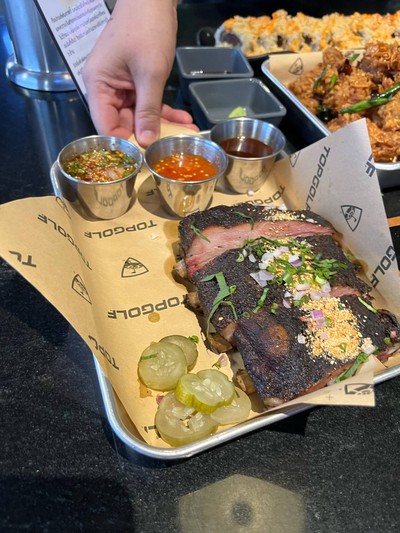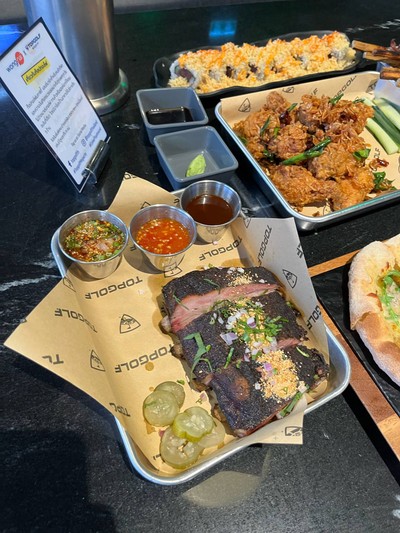 TopGolf ตั้งอยู่ติดกับเมกะซิตี้ บางนา มีที่จอดรถสะดวก ภายในกว้างขว้างมาก เครื่องมือเครื่องเล่นทันสมัย มี 3 ชั้น คนที่ตี golf ไม่เป็นอย่างเราก้อเล่นได้ เค้ามีเกมส์ให้เล่น เน้นสนุก วันนี้สนุกมากจิงๆ ระหว่างตี golf ก้อมีเมนูมากมายมาเสริฟ์ -หมูปิ้ง ที่ไม่ใช่หมูปิ้งทั่วๆไป หมักมาได้อร่อยถึงเครื่อง ย่างมาร้อนๆหอมๆ - ไส้กรอกเยอรมัน หนักกรอบสุดๆ - พิซซ่าไวท์ชีสและทรัฟเฟิล เด็ดสุดๆต้องสั่ง - ปีกไก่ท...อ่านต่อ