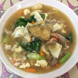 เหลือเชื่อจริงๆ ห้องแถวห้องเดียวแต่ขายเมนูเยอะมาก ที่ขึ้นชื่อของร้านก็คือ 🍜 ก๋วยเตี๋ยวต้มยำไข่มะตูม น้ำใสก็มีนะ 🍲 ก๋วยจั๊บหม้อดิน เมนูข้าวต่างๆ (ดูในรูปที่โพสต์) แถมหน้าร้านมีซุ้มขายเครื่องดื่มด้วย ชา กาแฟ อะไรประมาณนั้น มาว่ากันถึงก๋วยจั๊บหม้อดิน...... รสน้ำก๋วยจั๊บต้องให้ผ่านเลยแหละ เลือดที่ใส่มากัดแล้วยังกะเจลลี่เลย เด้งกรุบ เส้นก๋วยจั๊บเหนียวกำลังดี ไม่ยุ่ยเปื่อยดูเพิ่มเติม