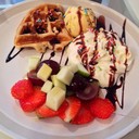 มีวาฟเฟิล 1 ชิ้น มีวิปครีม เสริฟมาพร้อมกับผลไม้สด มีเนื้อสตอเบอรี่ องุ่นแดง แอปเปิ้ลเขียว ผลไม้สดใหม่ดี และมีไอศครีมวานิลา 1 ลูก ราดด้วยไซรัป หอม หวาน ใช้ได้