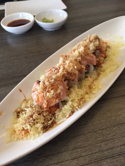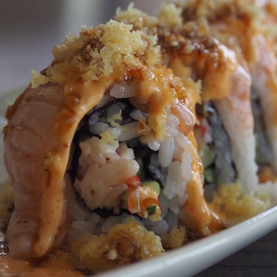 ปูอัด อโวคาโด แตงกวา แซลมอนย่างไฟ เกล็ดเทมปุระ