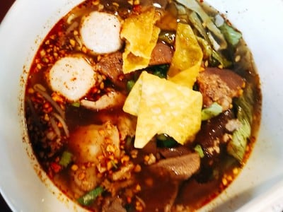 ร้านก๋วยเตี๋ยวมีทั้งเมนูหมู เมนูเนื้อ ร้านร่มรื่นมาก เย็นสบาย โต๊ะนั่งกว้างขวาง เหมาะสำหรับกลุ่มหลายคนนั่งด้วยกันได้สบายค่ะ ราคาเริ่มต้น 60 บาทต่อชาม พิเศษ ราคา 80-100 บาทต่อชาม บริการรวดเร็ด นำ้เปล่าน้ำแข็ง และผักสดบริการตนเองค่ะ รสชาติอาหารใช้ได้ ที่จอดรถมีด้านหลังร้าน ร้านติดถนนสันกำแพงสายใหม่ค่ะดูเพิ่มเติม