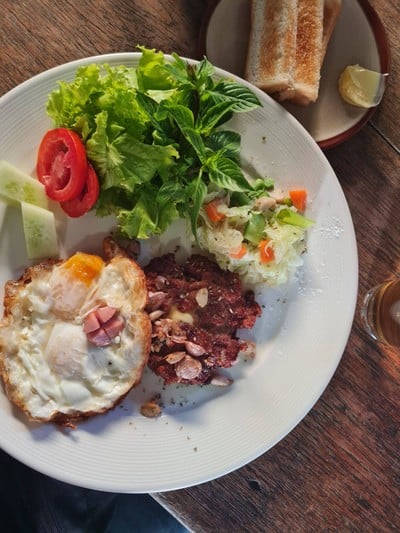 ร้านอาหารเช้าง่ายๆ ที่มีเมนูแปลกตาให้เราได้เลือก หรือใครอยากทานกาแฟ กับไข่ลวก และขนมปังปิ้งก็มี ร้านเป็นร้านเล็กๆ มีโต๊ะไม่มาก ส่วนเรื่องรสชาติ จากที่ได้ลองทาน - ชุดอาหารเช้า (70฿) จุดเด่นชุดนี้อยู่ที่หมูทอด คืออร่อยว้าว มีความหอม กรอบนอกนอกนุ่มใน อร่อยเลย - โตเมโตผัดไข่ (60฿) รสชาติหอมอร่อยดีมาก ตัวชาร้อนมีให้ฟรี น้ำร้อนมากๆ ระวังด้วยนะ กลิ่นชาหอมใช้ได้ เรื่องรสชาติชื่นชม แต่อยากให้พัฒนาความ...อ่านต่อ