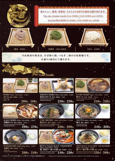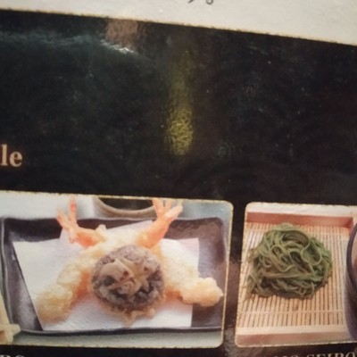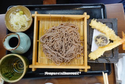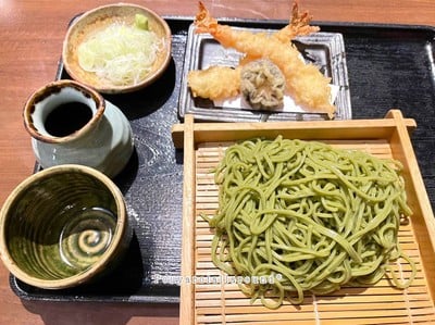 โซบะเย็นชาเขียวและกุ้งเทมปุระ