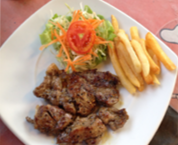 (สันคอหมูติดมัน) เสิร์ฟพร้อมผักสดและเฟรนฟราย (ไม่มีซอสเกรวี่ให้ สามารถซื้อเพิ่มได้) ถ้าไม่เอาผักหรือเฟรนฟรายสามารถเปลี่ยนเป็นขนมปังหรือเพิ่มอย่างใดอย่างหนึ่งได้