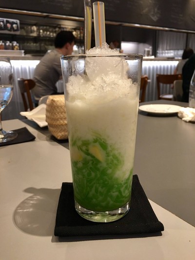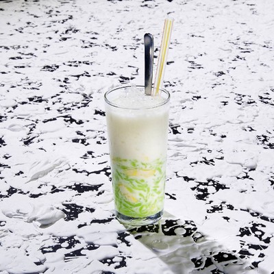 เส้นลอดช่องนุ่มหนึบ ใส่นํ้าเชื่อม ขนุน นํ้าแข็งขูดฝอย ราดด้วยกะทิสด