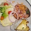 สเต็กและสลัดบาร์ตักได้เรื่อยๆ ไม่จับเวลา มีเครื่องดื่มอัดลมรีฟิลล์ด้วย ส้ต็กอร่อย คุณภาพดี มีหลากหลายมาก ทีเด็ดอย่างซี่โครง สเต็กเนื้อก็มี ขาหมูทอดเยอรมัน ขนาดไม่ใหญ่มาก กรอบพอประมาณ บางส่วนก็แข็งไปหน่อย เมนูที่ชอบที่สุดจะเป็นไก่ เนื้อไก่ที่นี่เนื้อนุ่ม แม้แต่เนื้ออกยังนุ่ม ฉ่ำไม่แห้ง สลัดบาร์ มีเติมเรื่อยๆ น้ำสลัดมีให้เลือกหลายสไตล์ แต่ชอบสุดจะเป็นครีมงา ผักสดมาก ซุปบัดกุดเต๋ เป็นอกไก่ รสอ...อ่านต่อ