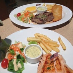 ชุดสเต็กหมู + ไส้กรอก และ ชุดสเต็กเนื้อ + มันบด เสริฟ์พร้อมสปาเกตตี้ไส้กรอกผัดพริก ตัวชุดสเต็กหมสเต็กหมูคุโรบูตะ (นุ่มมาก) ไส้กรอก เป็นเครื่องเคียง ตัวนี้เป็นราคาโปรโมชั่นเสิร์ฟคู่ถือว่า คุ้มค่า คุ้มราคาเลย ในด้านของรสชาติ หมูนุ่มโอเคใช้ได้ เซ็ทนี้เขายังมีน้ำชามะนาวเสิร์ฟพร้อมในเซ็ท ถือว่ามาในเซ็ทเดียวจบเลย ถัดมาเป็นสเต็กเนื้อระดับมีเดียมแรร์ พร้อมด้วยมันบด รสชาติถูกปาก ส่วนตัวขอบมันบดราดซอสตัว...อ่านต่อ