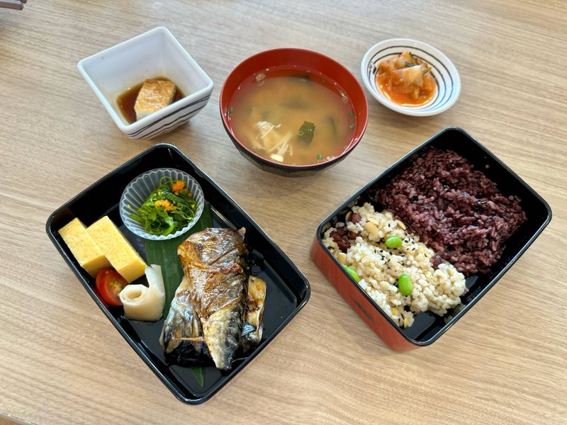 ชุดปลาซาบะย่างซีอิ๊วเสิร์ฟพร้อมข้าวญี่ปุ่นฟูจิมุราซากิและข้าวกล้องธัญพืช