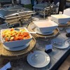 อาหารเช้าของโรงแรม เริ่มตั้งแต่ 7.00 - 10.00 น. ของทุกวัน ห้องอาหารดูเล็กไปทันที เมื่อแขกลงมาทานพร้อมๆ กัน ผมเข้ามาทาน 7.30 น. โต๊ะเกือบเต็มแล้ว แต่พอเริ่ม 8.00 โมง ก็ทยอยลุกกันเยอะ อาจเป็นเวลาของทัวร์ด้วย ไลน์อาหารค่อนข้างหลากหลายดีครับ รสชาติพอทานได้ อร่อยตามมาตรฐานของโรงแรมทั่วไป แต่พนักงานอาจน้อยไปช่วงแขกเยอะ เก็บโต๊ะเก็บจานไม่ค่อยทันดูเพิ่มเติม