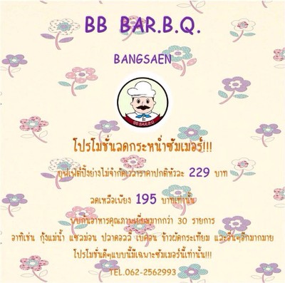 ร้านตั้งอยู่ในซอบมาบมะจมหรือซอยสามเเยกตลาดมังมุข ราคาตอนนี้หัวละ 195 บาท ลดจากราคา229บาท เป็นโปรโมชั่นช่วงซัมเมอร์ไม่รวมน้ำ น้ำจิ้มอร่อยรสชาดคล้ายบาบีคิวพลาซ่าเลย หั่นหมูบ๊างบาง นอกจากนร้มีพวกกุ้งหมุกปลา เเละอีกหลายอย่างดูเพิ่มเติม