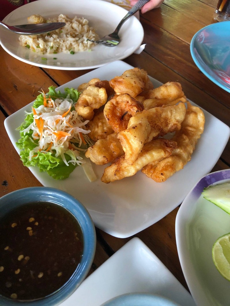 เดินมาจากโรงแรมข้างๆ เดินมาช่วงบ่ายสองครึ่ง เป็นเวลาที่น้ำลงพอดี เดินตามหาดมาได้ ร้านวิวดีมากกก -กุ้งลายเสือย่าง กุ้งไม่สด มีความเละหน่อยๆ -กุ้งลายเสือสามรส รสชาติโอเค รสไม่จัด เน้นหวาน -ปลาหมึกชุบแป้งทอด กรอบ เคี้ยวง่าย👍 -ใบเหลียงผัดไข่ ดีเลย อร่อย ใบไม่แก่เกิน -ปลากระพงทอดน้ำปลา ตัวไม่ใหญ่มาก ทอดดี ไม่เค็มเกิน -คั่วกลิ้งเนื้อ หอมเครื่องแกงมาก สั่งเผ็ดมาก แต่รสชาติที่ได้ สำหรับคนไทยทั่...อ่านต่อ