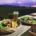 ระเบียงริมทุ่งนาบรรยากาศร้านน่ารักมากๆ เต็มไปด้วยของสะสม เรามาประมาณบ่าย 2 เดือนเมษาอากาศร้อนเป็นพิเศษ แต่ทางร้านก็มีพัดลมให้ ร้านมีมุมถ่ายรูปเยอะแยะเลย ใครชอบถ่ายรูปห้ามพลาด