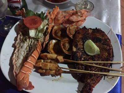 100% ของรีวิวบอกว่าร้านนี้เหมาะกับ เพื่อนฝูงเป็น 1 ในร้านอาหารทะเลที่หาดจิมบาลาน ร้านจะมีที่นั่งทั้งในตัวอาคารและที่หาดทราย ซึ่งจะตั้งโต๊ะและเก้าอี้ไว้ให้ แต่เวลานั่งเก้าอี้จะจมลงไปในพื้นหาดหน่อยนึงนะคะ อาหารที่ร้านนี้จัดเป็นเซ็ตซีฟู้ดคนละ 1 เซ็ต ซึ่งจะมีลอบสเตอร์หนักครึ่งกิโล 1 ตัว หอย ปลาหมึกลูกเต๋าเสียบไม้ กุ้งและปลาค่ะ ปลาก้างเยอะมากเลย ข้าวจะอยู่ในตะกร้าทรงสูง ซีฟู้ดจะถูกปรุงมาในสไตล์บาหลี ถ้าไม่คุ้นควรพกน้ำจิ้มซีฟูดไปด้วย ตัวซีฟู...อ่านต่อ