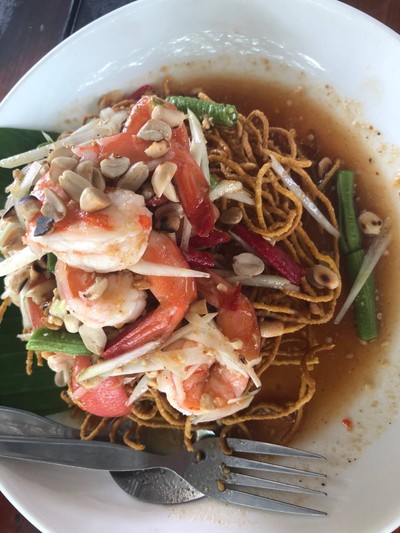 ร้านนั่งสบาย โปร่ง โล่ง ลมผ่านเย็นสบายๆ จอดรถง่าย พนักงานดูแลดีมาก แต่แมลงวันเยอะไปหน่อย ต้องปัดๆตลอดเวลา กินมือนึงปัดแมลงวันมื้อนึง บริหารมือกันไปค่ะ . รสชาติอาหารโดยรวมโอเคค่ะ อาหารได้เร็ว เรามาลองกิน พล่าไข่มดแดง เพราะไม่เคยกินมาก่อนเลย อร่อยดีค่ะ มันๆดี และเมนูแนะนำที่เราไม่ได้สั่งคือ หมูกรอบทอดน้ำปลา เพราะของยังไม่มาส่งเลยอดไป . ส้มตำหมี่กรอบ กุ้งสด ล้างสะอาดดีค่ะ เมนูนี้หวานนำไปนิด แต่ชอ...อ่านต่อ