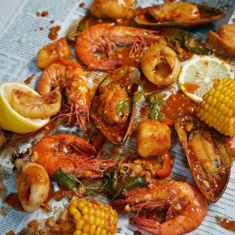 กุ้ง, หอยแมลงภู่นิวซีแลนด์, หมึก, มันฝรั่ง, ข้าวโพด