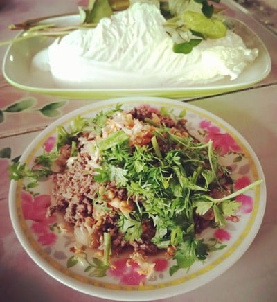 ลาบเก๊างิ้ว ร้านลาบซ้ายมือร้านแรกก่อนถึงบ้านกาดสังเกตง่ายๆตั้งอยู่บนเนินต้นตะขบ ที่ร้านมีเมนูพื้นเมืองเช่นลาบ,แกงอ่อม,ต้มแซ่บ,ปิ้งย่าง,และส้มตำ เมนูแนะนำที่ต้องทานหนีไม่พ้นลาบหมูคั่ว(40.-)เสิร์ฟมาพร้อมผักสดๆ หมูย่างกับจิ้นส้มร้านนี้ก็อร่อย สั่งส้มตำมาทานแก้เลี่ยนอีกสักหน่อยเป็นอีนจบ ปล.ที่ยังไม่แนะนำพวกแกงอ่อมต่างๆเพราะที่ร้านจะใช้เนื้อควายบางคนก็ไม่ทานเลยขอข้ามไปครับดูเพิ่มเติม
