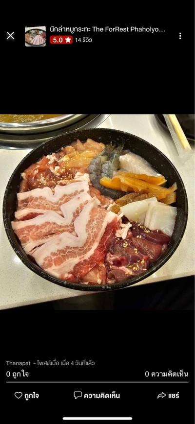 ร้านตั้งอยู่ใน the ForRest Phaholyothin มีที่จอดรถเยอะสะดวกสบาย เซตนักล่าหมูไซส์ M. ราคา 279 บาท เหมาะสำหรับ 1-2 คน เซตนักล่าหมูกระทะไซส์ L ราคา 399 บาท เหมาะสำหรับ 2-3 คน เซคนักล่าหมูกะทะไซส์ XL ราคา 499 บาท เหมาะสำหรับ 4-5 คน หรืออยากสั่งแยกคอนโดได้ พวกเนื้อวัว เนื้อหมู เนื้อไก่ ลูกชิ้นต่างๆ ราคาเอาเรื่องพอสมควร เตาให้ความร้อนกำลังดี พวกเนื้อสัตว์ต่างๆย่างมาไม่ได้มีอะไรโดดเด่น ก็หมู...อ่านต่อ
