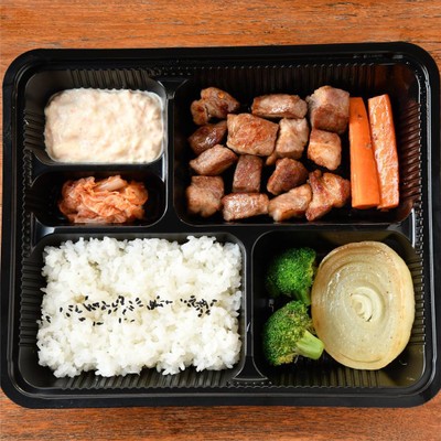ชุดเบนโตะ สเต๊กหมูดำคุโรบูตะ พร้อมข้าวญี่ปุ่น ผักผัดและกิมจิ