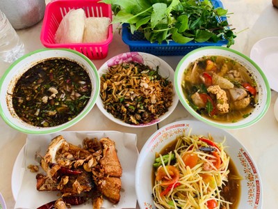 ลาบปลา ปลาส้มทอด หมูทอด แอ่บปลา ต้มแซ่บไข่ปลา ส้มตำ นี่เป็นอาหารที่สั่งมา ทุกอย่างอร่อยหมด เว้น ส้มตำ ที่มาช้าสุดๆและทำมาจากข้างนอกแล้วเอามาส่ง เส้นเฉามากและหวาน เสียดายมาก ถ้าไม่ได้ทำเอง หรือยุ่งยากควรเอาออกจากเมนู ส่วนจาน ช้อน ส้อม แก้วน้ำ ควรสะอาดกว่านี้จะดีมากๆดูเพิ่มเติม
