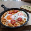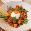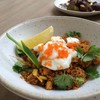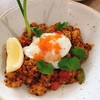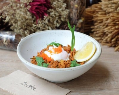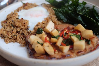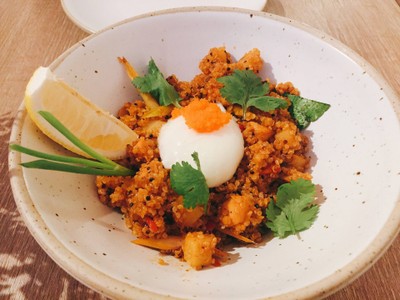 Quinoa Fried with the well-known Thai Tom-Yum spices with coconut heart and diced salmon topped with onsen egg