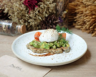 Smashed avocado, smoked salmon, poached egg, balsamic dressing and toast