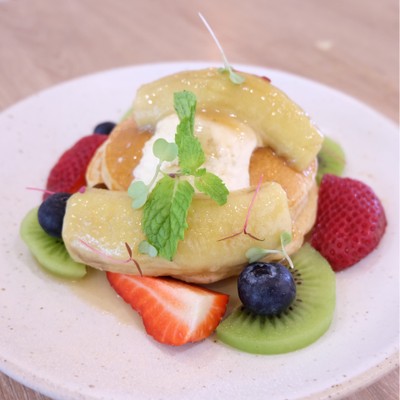 Our homemade ricotta cheese, caramelized banana fresh fruits and coconut butterscotch