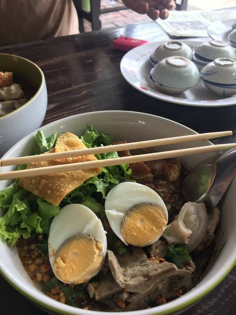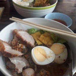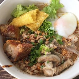 ก๋วยเตี๋ยวต้มยำ เครื่องทะลัก มีจุดต่างที่ใส่ไข่ และเลือกได้ไม่ว่าจะเป็น ไข่ลวก ไข่ต้ม หรือไข่มะตูม น้ำซุบอาจจะติดหวานไปหน่อย แต่หอมกลิ่นพริกคั่ว เส้นบะหมี่ดี เครื่องในลวกสุกกำลังดี หมูกรอบชิ้นโต พร้อมถั่วคั่ว ร้านบรรยากาศร่มรื่น มีลมโกรก ไม่ร้อนเท่าไหร่ แต่อาจจะต้องรอคิวนานนิดนึงดูเพิ่มเติม