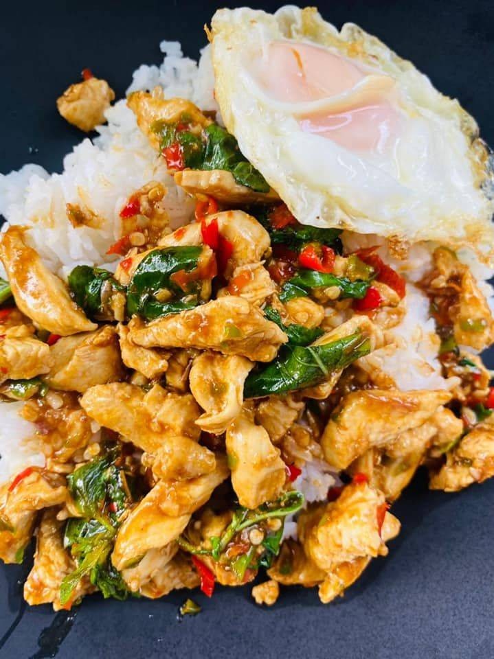 กะเพราถาดพริกแห้งสูตรคุณแม่(ใช้ข้าวหอมมะลิแท้ตราไดโนเสาร์)