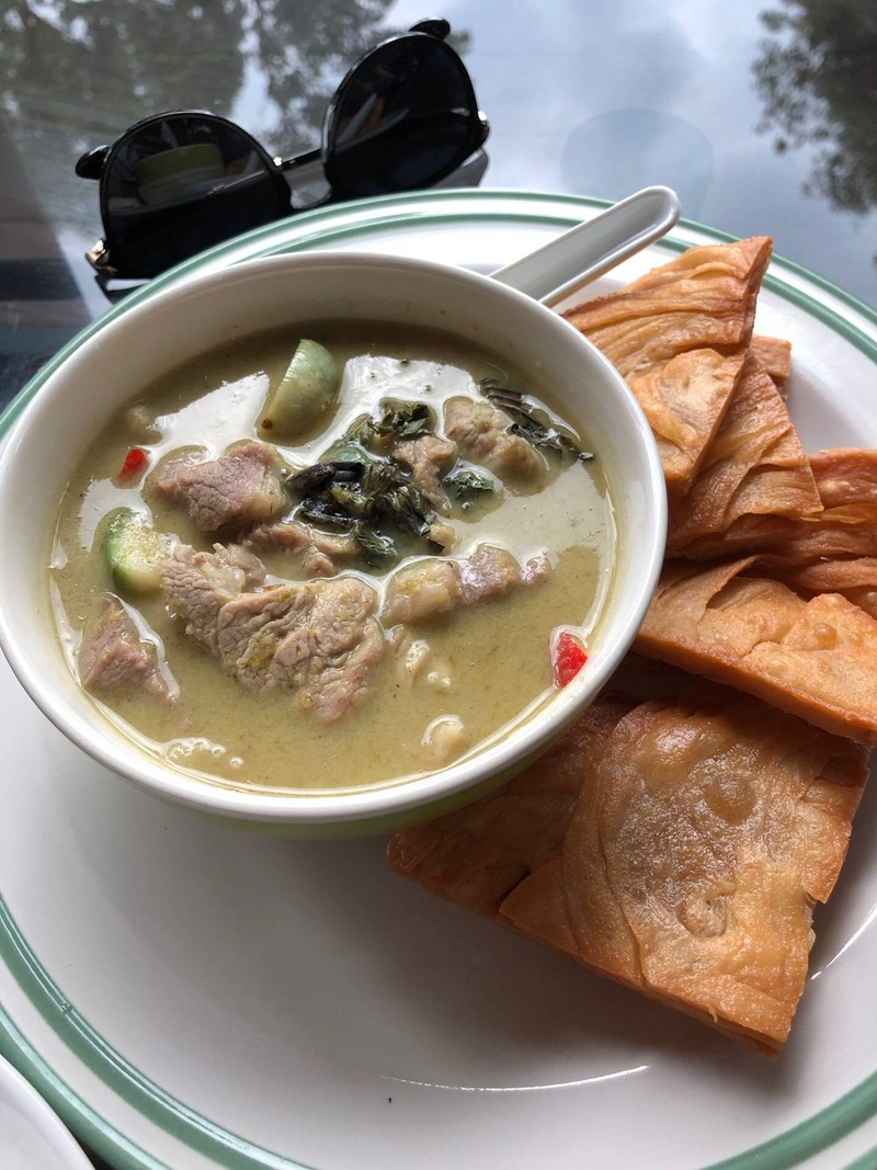 ตั้งใจจะไปเดอะไจแอนท์ แต่ผิดหวังเพราะมาแล้วร้านปิด ติดๆกันมีร้านนี้เปิดอยู่ แม้จะอยู่ใกล้กันมากแต่วิวคนละเรื่องเลย ที่นี่วิวป่ารกทึบ ไม่โปร่งเหมือนเดอะไจแอนท์ สั่งอาหารมาลองมีโรตีแกงเขียวหวานที่รสชาติโอเค สปาเก็ตตี้ต้มยำกุ้งเหมือนเอาเส้นไปผัดกับเครื่องต้มยำกุ้งสำเร็จรูปมันเข้มข้นหนึบหนับแต่ฝาดลิ้น ยำคอหมูย่างมีกลิ่นสาปนิดๆ ปริมาณน้อยไปหน่อยแต่น้ำยำโอเค ผักโขมอบชีสรสชาติปกติให้ผักเยอะดีแต่ชีสบาง...อ่านต่อ