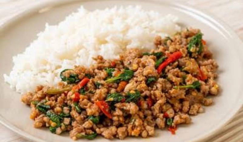 กะเพราถาดพริกแห้งสูตรคุณแม่(ใช้ข้าวหอมมะลิแท้ตราไดโนเสาร์)