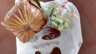 ระหว่าเรานั่งดื่มกาแฟ เกิดอยากกินข้าวห่อใบบัว เลยถามแม่ค้าแถวนั้น เค้าแนะนำให้มาซื้อที่ร้านหรั่งศรีโรจน์ ซึ่งเป็นร้านขายข้าวห่อใบบัวที่เก่าแก่ของที่นี่ ขายห่อละ 50 บาท ทางร้านจะมน้ำีอาจาดให้ด้วย เราเปิดชิม ด้านใยจะมีทั้งกุ้ง กุ้งแห้ง กุนเชียง หมูสับ ไข่เค็ม รสชาติจะออกจืดๆมันๆ ราดน้ำอาจาดช่วยเพิ่มรสชาติขึ้นเยอะเลยดูเพิ่มเติม