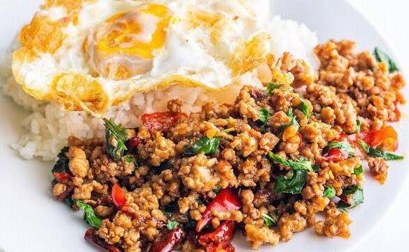กะเพราถาดพริกแห้งสูตรคุณแม่(ใช้ข้าวหอมมะลิแท้ตราไดโนเสาร์)