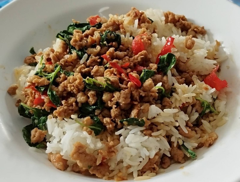 กะเพราถาดพริกแห้งสูตรคุณแม่(ใช้ข้าวหอมมะลิแท้ตราไดโนเสาร์)