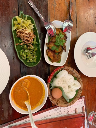 ปักหมุดไว้นานแล้ว ได้มาเก็บลิสร้านนี้สักที มาฝากท้องมื้อเที่ยงที่ร้านขนมจีนต้นก้ามปู ร้านดังในอยุธยา ตกแต่งแบบบ้านไม้ย้อนยุค ต้นไม้เยอะร่มรื่นดี 🦀 ขนมจีนปูก้อนคืออร่อยสมคำร่ำลือ รสจัดจ้านเข้มข้น แซ่บกำลังดี มีปูก้อมาพอประมาณ กินคู่กับขนมจีน 1 เสิร์ฟจะมี 3 ก้อน ในภาพคือเราสั่ง 2 เสิร์ฟนะ ผัดสดจะมี station ให้เดินไปตักได้ไม่อั้น แต่ต้องกินให้หมดนะ โซนผักรู้สึกไม่ค่อยสะอาดเท่าไร ดูไม่สด เมนูอาห...อ่านต่อ