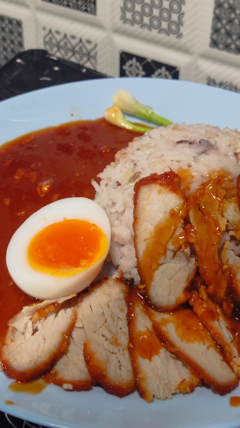 ข้าวหมูแดง-หลัวเสี่ยวเหวิน ใช้ข้าวหอมมะลิใหม่ ผสมข้าวสามสี+ไข่เป็ดยางมะตูม