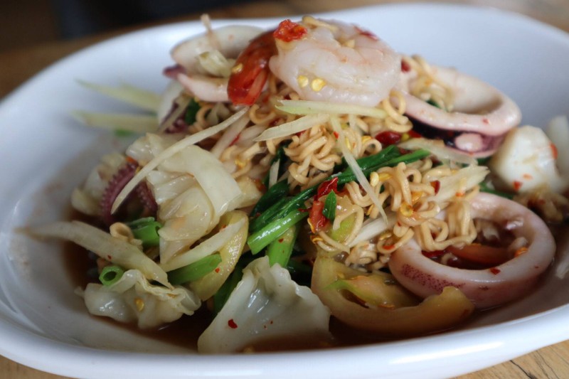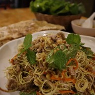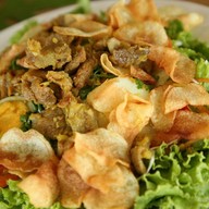 มาร้านนี้ทีไร ต้องสั่งสลัดญวนทุกครั้งไป เพราะรสชาติดี ส่วนผสมในจานลงตัว ผักสดไม่เหม็นเขียว มีทั้งผักกาดหอมเป็นฐานหลัก แซมด้วยกำหล่ำซอยเล็กน้อย มะเขือเทศฝานบางๆ วางปนกับไข่ต้ม และหมูสะเต๊ะนุ่มๆกลิ่นหอมกำลังดี โรยหน้าด้วยผักชี และมันฝรั่งทอดกรอบ (ปกติจะมีแตงกวาและหอมใหญ่ด้วย) ราดด้วยน้ำสลัดน้ำใสสูตรเวียดนาม ครั้งนี้เข้มข้นน้อยลง แต่ว่าอร่อยมากขึ้น จานนี้ราคา 100 บาท แต่ได้ปริมาณและคุณภาพเกิดคุ้...อ่านต่อ