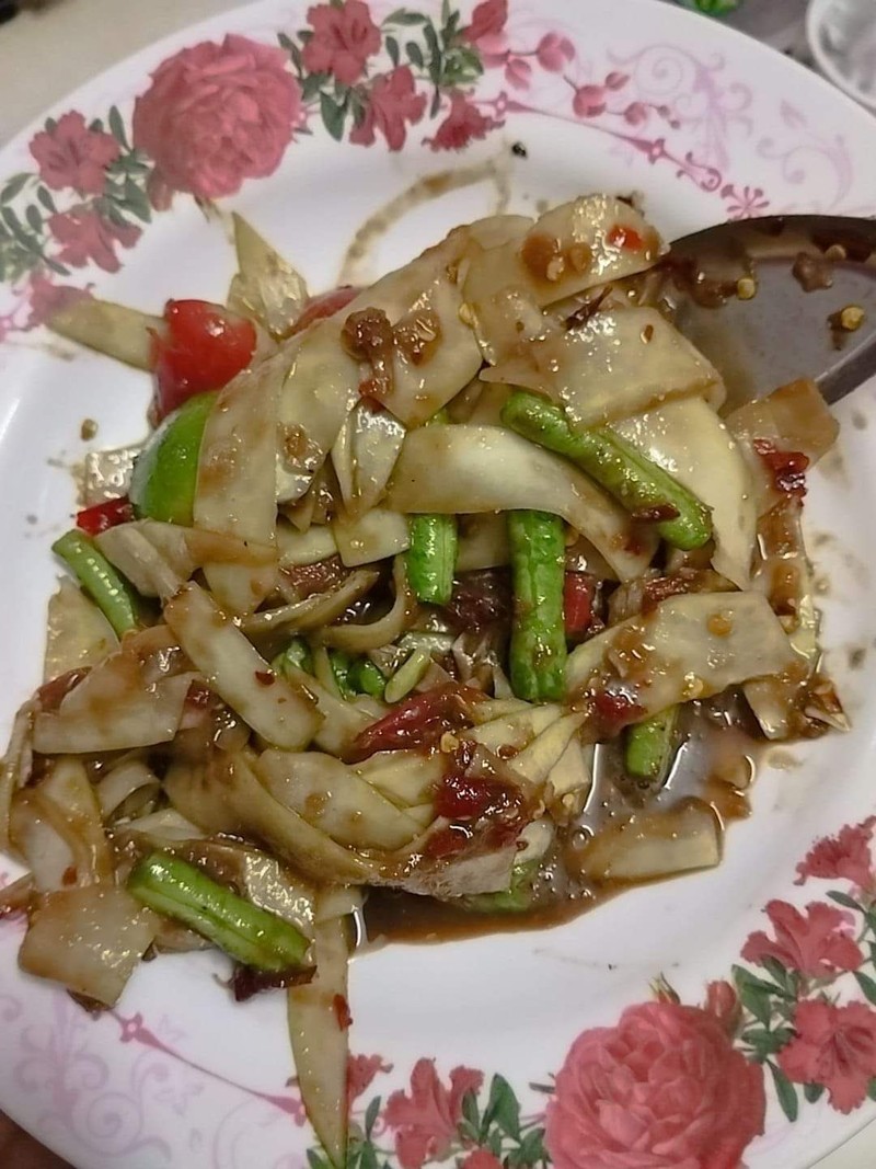 กะเพราถาดพริกแห้งสูตรคุณแม่(ใช้ข้าวหอมมะลิแท้ตราไดโนเสาร์)