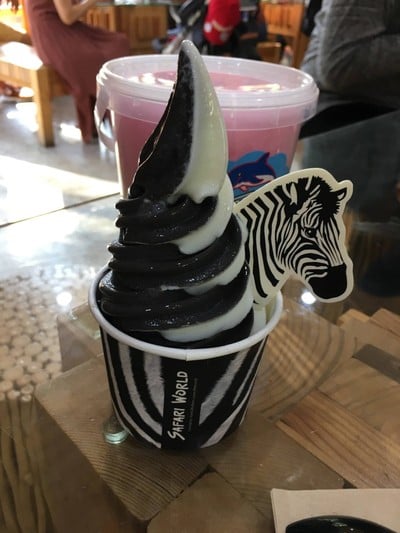 Safari world 🦓 วันนี้ไปเที่ยวซาฟารีเวิลด์มา เอนจอยมากๆเลย มีสัตว์ต่างให้ดูเยอะแยะไปหมด ข้างในมีร้านอาหาร มีคาเฟ่ด้วย มาในธีมสวนสัตว์ ขนมต่างๆก็เลยออกมารูปแบบนี้ ไอศกรีม soft serve รสโกโก้สลับกับวนิลลา เหมือนสีม้าลายเลย แบบโคน 150 บาท แบบถ้วย 130 บาท ส่วนตัวคิดว่ารสชาติเฉยๆ อร่อยตามแบบฉบับ soft serve แต่ด้วยราคาก็แอบแรงไปหน่อยดูเพิ่มเติม