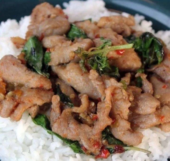 กะเพราถาดพริกแห้งสูตรคุณแม่(ใช้ข้าวหอมมะลิแท้ตราไดโนเสาร์)
