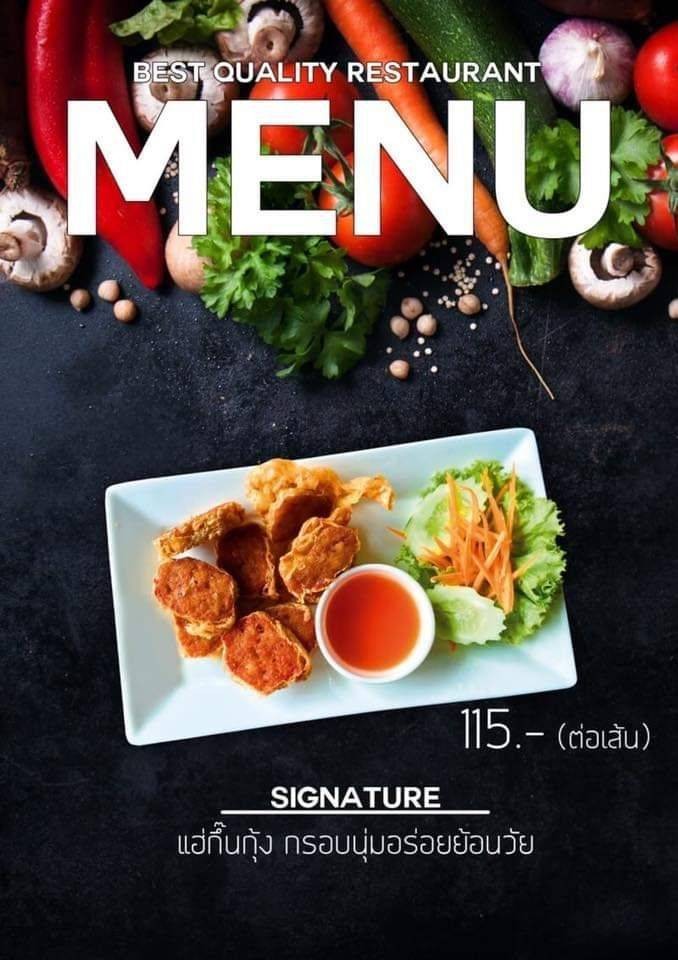 เมนูเด็ด: ฮ่อยจ๊อปู 10 เม็ด, ข้าวผัดปลาเค็มที่เล็ก, กุ้งอบวุ้นเส้น, แกงส้มชะอมกุ้ง, น้ำพริกไข่ปู, แฮ่กึ๊นกุ้ง (1เส้น), ฮ่อยจ๊อปู 15 เม็ด