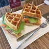 มาเจาะเลือดที่ รพ.มหาชัย 2 ค่ะ เลยมากินวาฟเฟิลหลังเจาะเลือดรองท้องก่อน สั่งวาฟเฟิลทูน่ามาลองกินค่ะ วาฟเฟิลนุ่มดี หอม แต่หวานเกินไป ทูน่ารสจืดๆ คิดว่าคงเป็นทูน่าในน้ำแร่ ราดด้วยมายองเนส มีมะเขือเทศและผักสลัดนิดหน่อย รสชาติโดยรวมคือยังไม่อร่อยค่ะ ธรรมดา เพราะว่าวาฟเฟิลหวานไป กินมากๆ แล้วเลี่ยน เข้าใจว่าคงทำมาให้กินคู่กับกาแฟจะได้มาตัดกันดูเพิ่มเติม