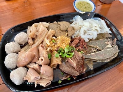 ร้านอยู่ตรงตลาดน้ำทอง เมนูแนะนำคือ ก๋วยเตี๋ยวเนื้อรวม ลวกจิ้มรวมเนื้อ และเล็กต้มยำหมูรวม ก๋วยเตี๋ยวเนื้อ เริ่มจากน้ำซุปที่เข้มข้น กลมกล่อม แทบไม่ต้องปรุง เครื่องที่ใส่มาให้ เนื้อตุ๋น เอ็นตุ๋น ลูกชิ้นจัดมาหนักมาเต็ม ส่วนลวกจิ้มรวมก็เด็ดสุดๆ น้ำจิ้มโคตรแซ่บ และท้ายสุดคือเล็กต้มยำหมูรวม รสชาติอร่อยลงตัวดูเพิ่มเติม