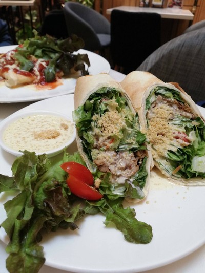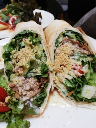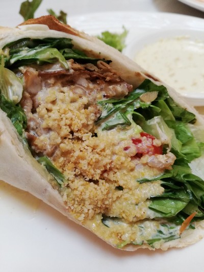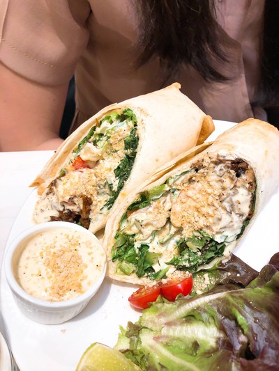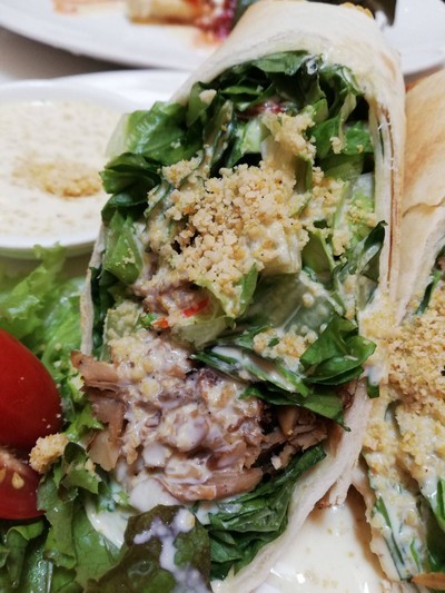 Baked Tortilla wrap filled with Ceasar salad, roasted mushroom and cashew nut parmesan.