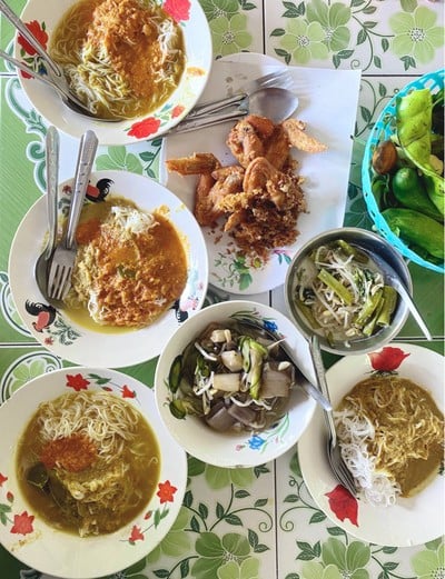 ตามพี่ๆเค้ามา ถามคนแถวนี้เค้าแนะนำให้มาร้านนี้ค่ะ พี่เค้าบอกว่าตัวเค้าชอบทานร้านนี้ขนมจีนอร่อย เลยมาลองดูกัน บรรยากาศร้านบ้านๆเลยค่ะ เป็นเพิงมีโต๊ะม้าหิน ผักเหนาะมีไม่เยอะมากแถมมีผักที่เราไม่รู้จักอีก ทานก็ไม่เป็น เอาเป็นว่าที่เราทานได้ก็มีแค่ถั่วฝักยาวกับแตงกวา ขนมจีนน้ำยาเราชอบค่ะเผ็ดถึงเครื่องแกง ขนมจีนแกงเผ็ดเพื่อนทาน เค้าบอกว่าอร่อยค่ะ เค้าชอบ มาลองชิมกันได้ค่ะดูเพิ่มเติม