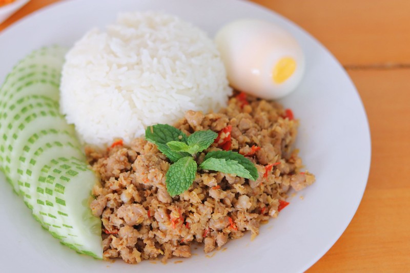 หมูสับชิ้นเล็กๆเอามาผัดใส่ตะไคร้และพริก ให้มีกลิ่นหอม เสริฟพร้อมไข่ต้มและแตงกวา ทานกับข้าวสวยร้อนๆ