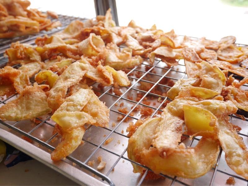 มะม่วงทอดแปลกใหม่มากๆสำหรับเจ้านี้เกิดมาไม่เคยกินมะม่วงทอดมาก่อนเป็นมะม่วงมันเอามาทอดเหมือนกล้วยทอดมันทอดเผือกทอดฟักทองทอดชุบแป้งพอกรอบๆสไลด์ให้บางบาง ได้รสสัมผัสของแป้งที่กรอบและดันน์ที่นิ่มเล็กน้อยไม่ถึงกับกรอบทั้งชิ้นเป็นรสสัมผัสที่แปลกใหม่ดีโดยเฉพาะบางชิ้นอาจจะมีรถเปรี้ยวของมะม่วงติดอยู่ทำให้เป็นเมนูที่ไม่มีใครเหมือนหนึ่งเดียวในใต้หล้า ครั้งหนึ่งต้องมาลองครับดูเพิ่มเติม