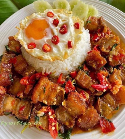 กะเพราถาดพริกแห้งสูตรคุณแม่(ใช้ข้าวหอมมะลิแท้ตราไดโนเสาร์)