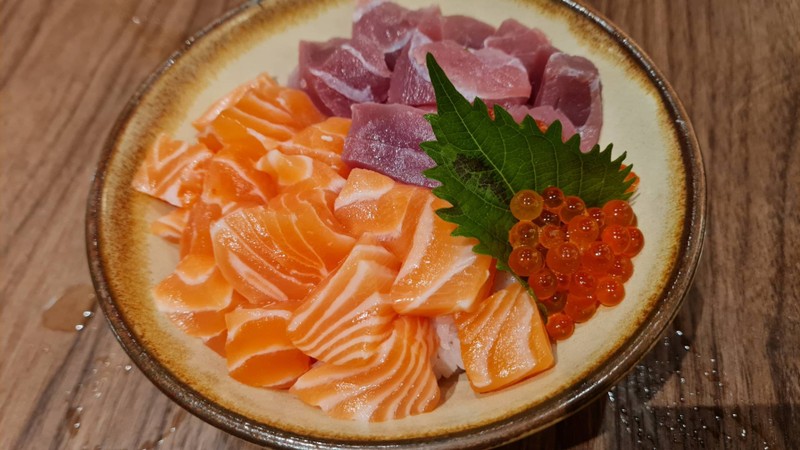 ข้าวหน้าปลาดิบรวม ประกอบด้วยฮามาจิ,อิคุระ,ทูน่า และแซลมอน หั่นในรูปทรงเหลี่ยมชิ้นพอดีคำ