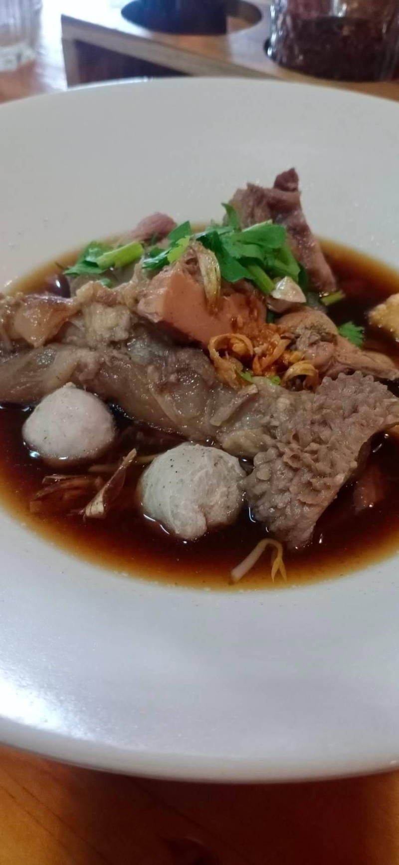 น้ำซุปสีเข้มหอม รสเค็มหวานกลมกล่อม เราเติมพริกน้ำส้มกับพริกป่นนิดหน่อย ให้เครื่องเยอะ ลูกชิ้นดี เครื่องตุ๋นเปื่อยนุ่ม ราคาเมื่อเทียบกับปริมาณถือว่าคุ้มค่า